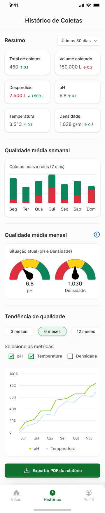 Controle completo na palma da sua mão. Registre coletas, visualize análises e acompanhe o histórico em tempo real